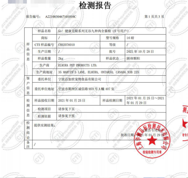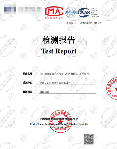 且不说Go!猫粮销售之前的种种国际权威检测和认证,单看这一次的临时送检,出具证明的是上海华测品标检测技术有限公司(CTI华测检测)。在网络上可以轻松查到,CTI华测检测是中国第三方检测与认证服务机构,中国国家强制性产品认证(CCC)指定认证机构,也是中国合格评定认可委员会(CNAS)和中国计量认证(CMA)机构。这种权威机构都不能相信的话?难道只能信微博上的那些无名ID的言论吗?