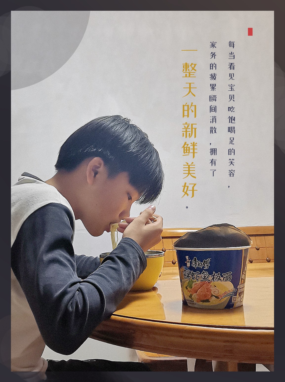 去年疫情期间,李晓方因病从职场退下,成为全职太太,白天忙活家务,给刚上初中的儿子做饭,晚上辅导他写作业。家里有个惯例,儿子考试成绩比之前进步,就可以给他买零食以示奖励。有一次,儿子期末考了高分,表示想吃鲜虾面。李晓方买回来康师傅鲜虾鱼板面,加了青菜和肉,儿子很开心:“妈妈做的比我自己泡的更好吃。”亲子间缺失的陪伴和爱,在一碗面中得以稍微弥补。