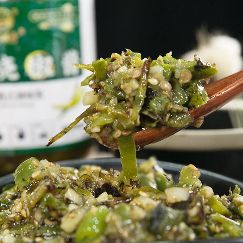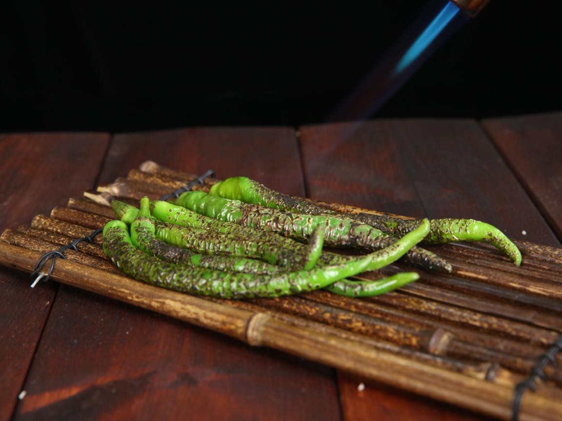 一瓶上好的烧椒酱除了用料好之外,制作工艺也是非常重要的一环。采摘之后的新鲜二荆条,经过特殊的炭烤工艺慢火烘烤,在将二荆条烤至点点虎皮花纹后,立马装盘,然后将烤好的烧椒和大蒜一起捣碎,加入调味料后开始炼油。
