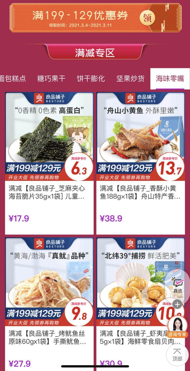 满减专区带来的都是海鲜味的零嘴,喜欢吃海鲜类的小馋猫一定不能错过这么划算的优惠,包括芝麻夹心海苔脆皮、舟山小黄鱼、手撕鱿鱼丝、海鲜零食扇贝肉、章鱼丸子、鱼肉棒等等,满减优惠就像白送一样。