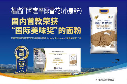 中粮福临门河套平原雪花(小麦粉)就来自于中粮粮谷设在巴彦淖尔市的高端面粉加工厂内。该工厂全套引进瑞士布勒全自动生产工艺,充分保证好粮出好粉。自2018年上市以来,福临门河套平原雪花(小麦粉)便连续两年获得“中国国际粮油产品及设备技术展示交易会”金奖;今年年初,其凭借卓越风味和质量,成为国内首款拿下被誉为美食界“奥斯卡”的国际美味奖(Superior Taste Award)面粉,妥妥的高品质保证。