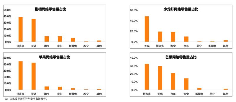 同时,在苹果、柑橘、芒果品类的网络零售量分布中,来自拼多多等新电商平台的渠道占比分别达44.35%、38.6%、32.2%,均排名第一。在“网红单品”小龙虾品类中,传统电商平台仍占绝对优势,但新电商平台消费增长迅速,渠道占比已跃居第二。