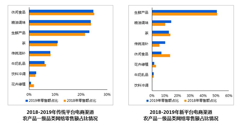 《报告》分析,以天猫、京东、淘宝为代表的传统电商平台中,农产品网络销售前三大品类依次为休闲食品、粮油调味、生鲜产品,占比分别为25%、23.8%、21.5%。但以拼多多为代表的新电商平台以及新零售渠道中,生鲜产品的网络零售额占比均超过50%,而传统电商平台生鲜产品零售额占比不足25%。