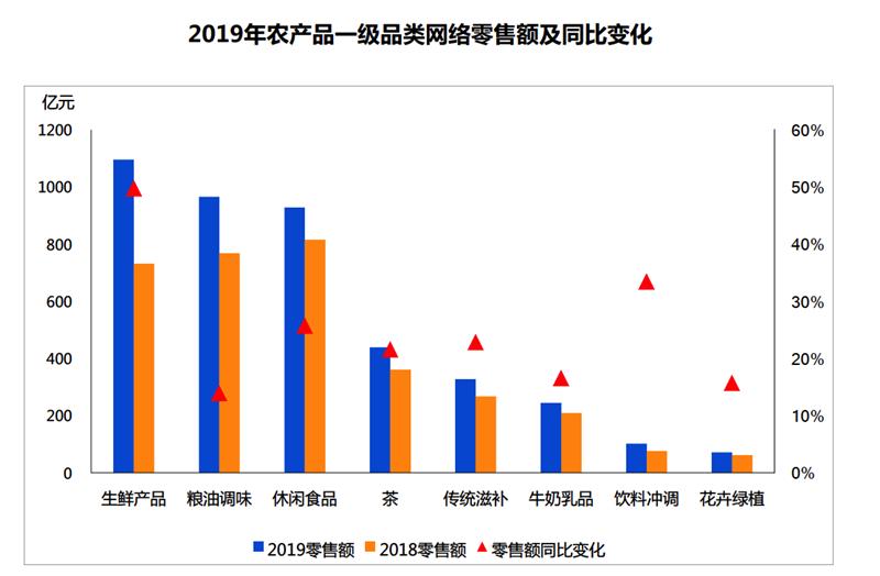 近日,在农业农村部市场与信息化司的指导与支持下,中国农业科学院农业信息研究所发布《中国农产品网络零售市场暨重点单品分析报告》(以下简称《报告》)。报告针对全国农产品网络零售市场进行分析,其中2019年生鲜产品网络零售额突破1094.9亿元,成为农产品上行第一大品类,网络零售量同比增加78.4%。