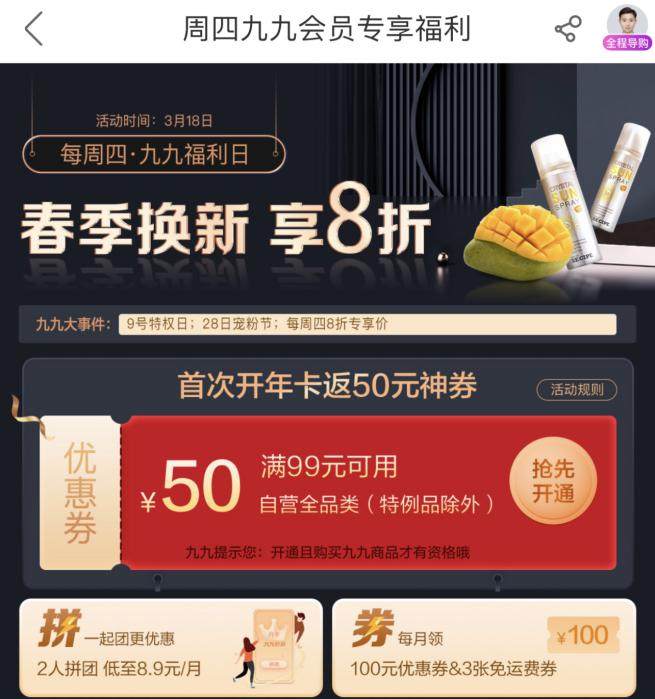 3月18日,也是“真快乐”APP的九九福利日,除了生鲜水果、美妆、日用百货、数码和厨卫家电等爆品享受8折狂欢折扣外,在这一天首次开通九九会员年卡的或者连续年卡的用户,还可以得到一张满99元返50元的优惠券,超值划算入会不亏哦。