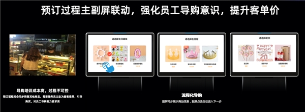 和1.0版本相比,客如云烘焙2.0版本支持多屏互动,多元化商品展示,全面替代了印刷纸质菜单的作用。平板手机等移动端都可以预订,可以用视频、图文等更直观生动的方式来展示商品详情,促成转化,让订购选购过程更加直观。在预订环节,主副屏联动,让导购流程化,主副屏同步展示商品信息,消费者和员工可以保持在同一频率,同频交流不迷路,也会有效地提高店铺在各类点评平台的好评度,这一切都指向一个目标:即有效促进预订转化,提升客单价。