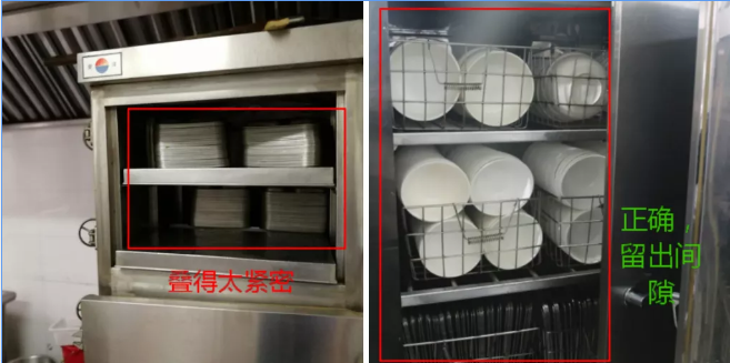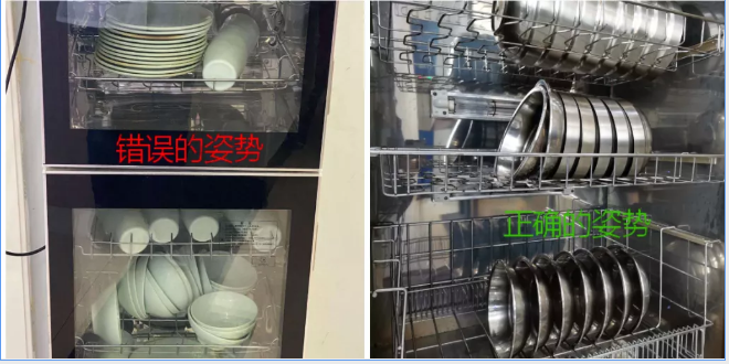 情况六:靠得太紧密。中间部分的餐具无法达到预期的消毒温度。不锈钢餐具可以通过延长消毒时间的到解决,但是密胺餐具就不能长时间高温了。建议将餐具放置时留出空隙。