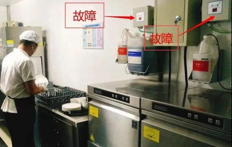 情况十:机器设备故障。洗碗机洗涤剂或者催干剂输送泵故障,无法按照比例输送液体至洗碗机,等于就是将餐饮具在洗碗机里热一下。