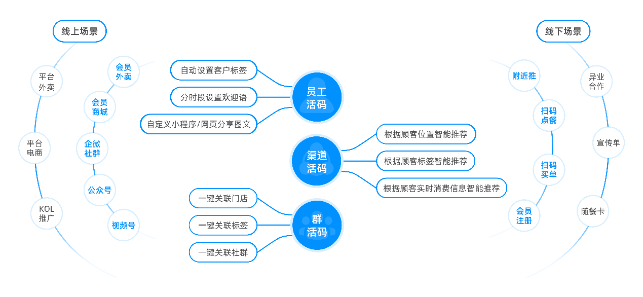 本次对接升级后,微盟智慧餐厅后台新增员工活码、入群活码、渠道活码三大引流工具,助力餐企全渠道获客引流,精细化运营管理社群。具体来说,通过员工活码,商户实现了自动设置客户标签、分时段设置欢迎语、自定义小程序/网页分享图文等自动化、个性化的新用户管理功能;入群活码则通过关联门店、标签、社群等功能,帮助商户精细化管理门店、社群、顾客之间的关系;渠道活码所具备的根据顾客位置、标签、实时消费信息,智能推荐顾客添加好友、进群的功能,不仅能帮助商户精准定位顾客群体、筛选种子用户,还能避免用户误入不感兴趣的社群,提升用户体验。