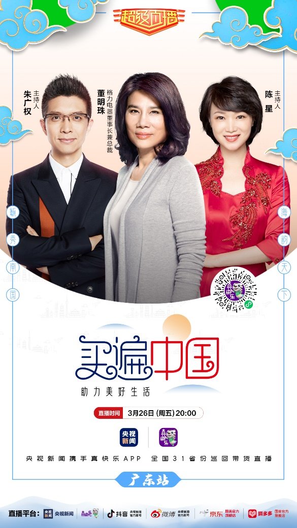 3月26日,国美携手央视新闻举办的“买遍中国”全国巡回带货直播走进广东。央视著名主持人朱广权、陈星搭档,嘉宾董明珠坐镇,跟全国网友一起嗨聊生活在广东的那些事儿。