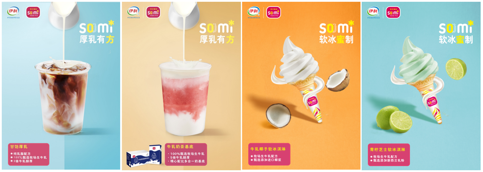 索非蜜斯(SOMI-SOFIE MIX)始于2010年上海世博会,是伊利集团倾力推出的伊利首个软冰淇淋品牌,是伊利全资拥有的乳制品原料供应商。乳品基底搭配其他食材,造就多彩冷饮方案的索非蜜斯,拥有软冰原料和饮品原料两大产品线,依托于优质乳源,先进工艺,强大研发团队,致力于为餐饮客户提供香浓细滑的冰淇淋和饮品乳品原料。在原料党逐渐兴起的大热趋势中,传承名企基因的索非蜜斯在中国乳品行业内有着重要的影响力,据悉,伊利索非蜜斯已经与多家大型茶饮连锁合作,并推出厚乳饮品。