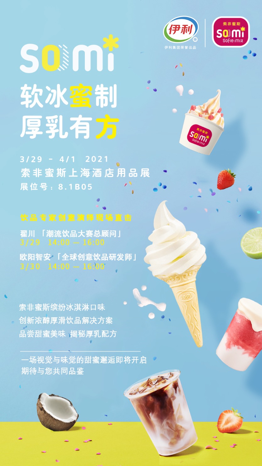 3月29日-4月1日,第三十届Hotelex上海国际酒店及餐饮业博览会在上海国家展会中心举办。以“软冰“蜜”制 厚乳有方”为主题的伊利索非蜜斯将出席展会(展位号:8.1B05),与行业合作伙伴共同分享索非蜜斯软冰新口味,新式饮品创意应用方案。据了解,现场还将有行业饮品大师级分享饮品研发理念,以及春夏潮流饮品创意配方。
