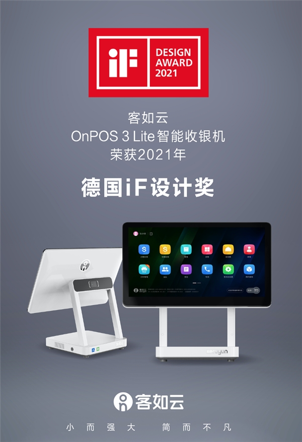 此次客如云onPOS 3 Lite智能收银机从全球数千件参赛作品中脱颖而出,荣获2021年度德国IF产品设计奖,也证明了客如云产品卓越的设计品质已获得国际认可,实力毋庸置疑。
