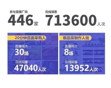 此次,参与直播的厂商有446家,在线观看713600人次。其中,20分钟直面采购人直播30场,在线观看47040人次,爆品菜制作人说直播8场,在线观看13952人次。