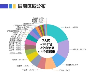 参展展商来自7大区、20个省、2个自治区、4个直辖市,其中山东省最多占19.53%,湖北省占14.37%居第二,福建省占9.21%居第三。