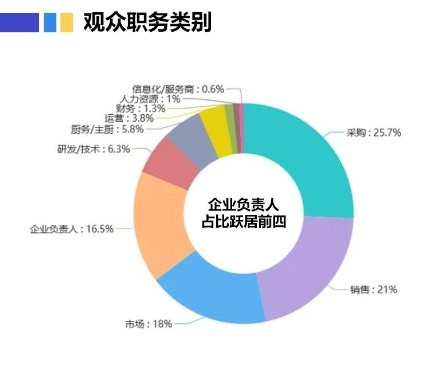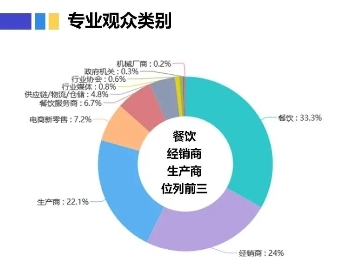 所处行业包括机械厂商、政府机关、行业协会、行业媒体、供应链/物流/仓储、餐饮服务商、电商新零售、餐饮、经销商、生产商等各行各业,其中餐饮行业的观众占33.3%、经销商占24%、生产商占22.1%,位列前三。