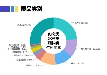 展品涵盖肉禽、面点、水产、果蔬饮料、农副产品、酒店用品、供应链物流、餐饮信息服务、机械、投资加盟、调料及干货。其中,肉禽类占27.54%、水产类占23.65%、调料及干货占12.57%,在展品中位列前三。