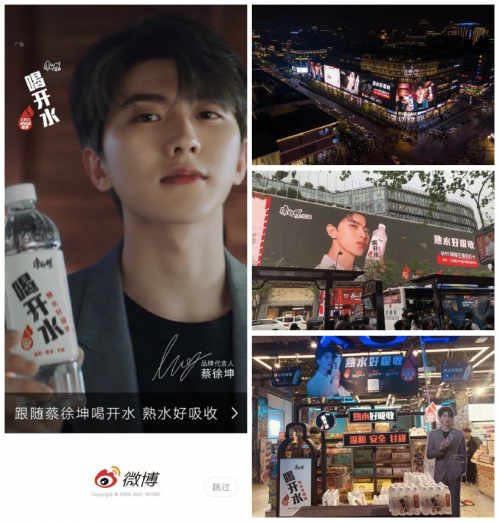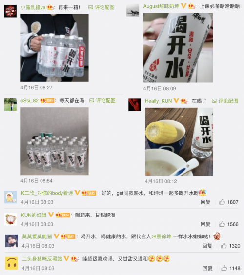 为了更好地跟年轻人玩在一起, TVC上线之后,品牌还进行了一系列社交互动活动,通过互动解锁应援礼,提升粉丝参与感,拔高事件势能,让喝开水和蔡徐坤这对沸腾组合再次成为全网关注的焦点,通过多重路径的不断强化,再一次加深了消费者对于喝开水“熟水好吸收”的品牌认知。