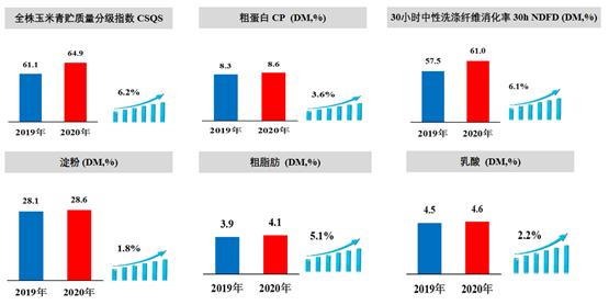 报告显示,按照全株玉米青贮质量分级指数(CSQS)评价,2020年我国CSQS平均值为64.9分,同比提高6.2%,30小时中性洗涤纤维消化率、淀粉含量和乳酸含量平均值比2019年分别提高了6.1%、1.8%和2.2%。粮改饲试点地区90%以上全株玉米青贮质量达到良好水平,比2019年提高5个百分点,其中17.5%达到优秀水平,比2019年提高8.5个百分点。