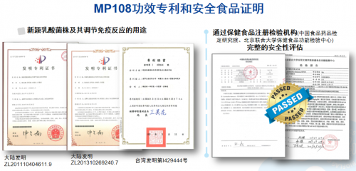 MP108分离自中国健康婴幼儿肠道,历经10年潜心研究,6层严苛筛选,透过不同耐受性和功能性平台试验,最终在1000多菌株中精选而出,成为锦旗生物集团五大明星菌株之一,自2015年起,锦旗生物研发团队即针对MP108规划了系列严苛试验,从体外到动物体内再到人体临床,仅人体临床研究这一项目,便耗费6年近900人的临床循证。主要功效为预防小儿轮状病毒肠炎、特异性皮炎、肠道手术后肠道菌群影响、过敏性鼻炎等。目前MP108已发布专利3项、发表学术论文9篇,其中SCI发表2篇,并通过保健食品注册检验机构的安全性评估的等一系列检测,获欧洲食品安全局QPS的安全菌种论证及台湾可用食品原料一览表正面表列。