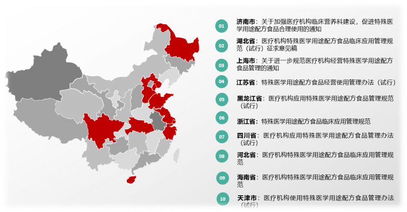截至目前,全国已有10个省、市地区发布特殊医学用途配方食品流通临床应用管理政策,近期政策的高频度发布,意味着特医食品越来越亟待市场规范化。