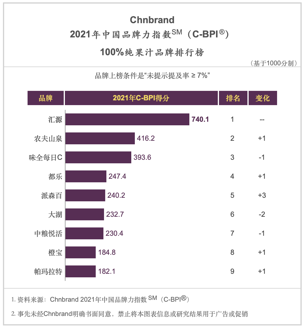 中国品牌力指数(C-BPI)是中国首个品牌价值评价制度,于2011年推出,并被纳入工信部品牌政策体系,受工信部专项资金的扶持,是备受消费者和企业信赖的品牌评价制度。2021年中国品牌力指数(C-BPI)调查区域覆盖全国100个城市、 203个行业,涉及被评价主流品牌10100余个。在100%纯果汁类,汇源连续11年蝉联该榜单的冠军,彰显了品牌的深厚实力与优秀口碑。