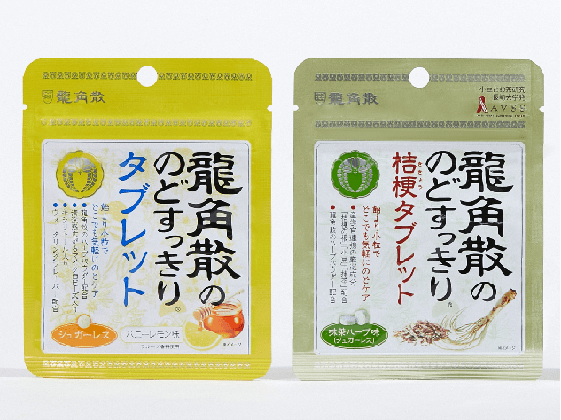 蜂蜜柠檬味润喉片,添加了特别滋润成分和清凉微粒,滋润咽喉的同时,可以给咽喉带来清凉快感。草本抹茶味润喉片,添加了有止咳祛痰、宣肺等作用的桔梗粉末,对咽喉有更好的护理功效。此外,还添加了由龙角散与长崎大学共同研发的具有抵抗流感病毒作用的AVSS健康成分,使得该产品具有抗病毒和护嗓的双重功效。