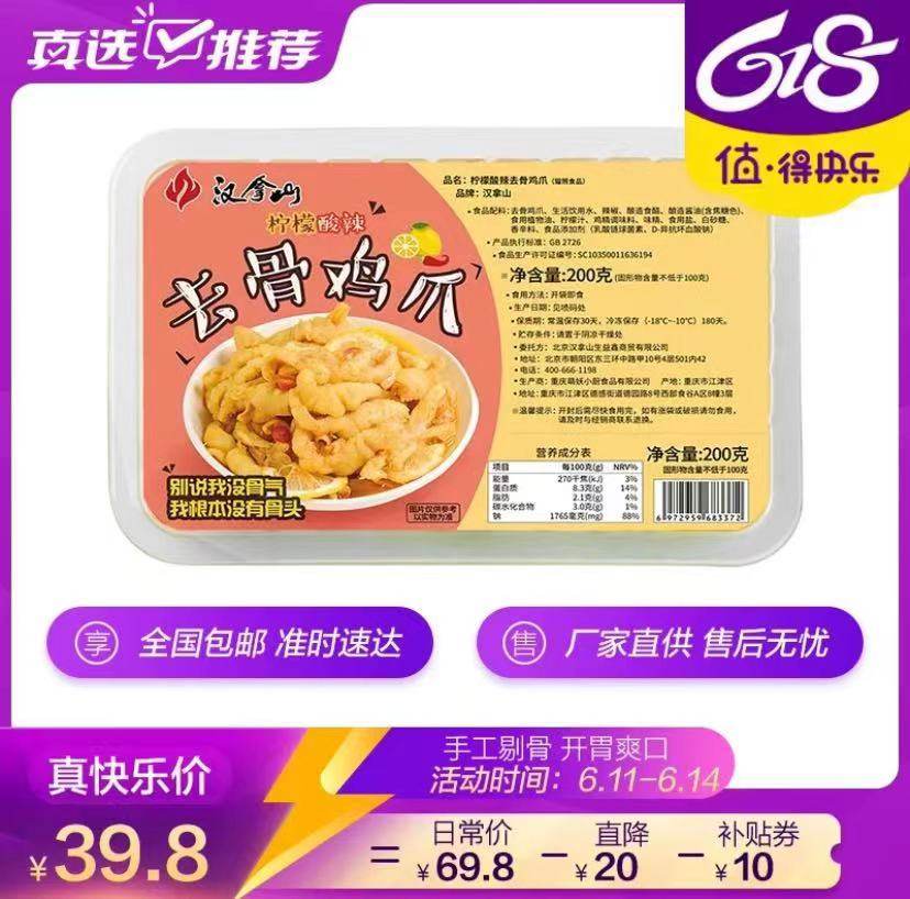汉拿山酸辣无骨鸡爪每袋200g,口感酸辣脆嫩,柔韧弹牙,鲜香嫩滑,一口一个又清爽又过瘾。其精选鸡爪,通过手工剔骨,让一斤凤爪可得4两肉;同时甄选多种香料,加入新鲜柠檬汁,通过层层渗透,保证酸辣开胃。无论是当凉菜吃,还是日常解馋,都非常合适。 http://gome.cn/CH9eR