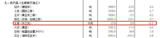 其中,生猪(外三元)本期价格15.8元,跌幅达-11.2%。