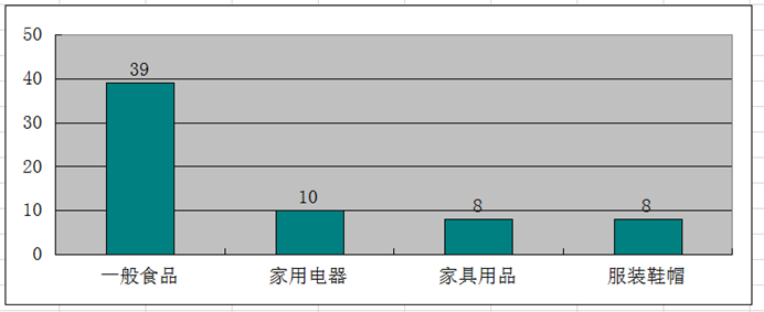 投诉举报量居前三位的分别是一般食品类(39件)。家用电器类(10件)、家居用品类(8件)、服装鞋帽类(8件)。