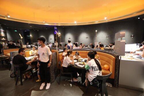 首先最直观的改变就是店面环境的升级,从感观上给予了LAB店更加“实验性”的外观风格。黑灰搭配了部分的橙色色调,似乎代表了前期所表达的烤鱼延续一万年的火种和神秘原始气息。在整体结构上增加线条分明的金属感呈现出未来科技氛围,映衬此次概念店的“LAB”实验风格。进店后可以明显感知到的是,这家LAB店从空间的应用上更能从顾客视角出发,设置了更多具有私密感的环绕式卡座,增加了隐藏在桌下的置物笼箱,卡座位置上的设计与自助的茶水台与冰粉台距离分配均匀。整体从店面设计开始,已经在提升顾客就餐时的舒适性与便利性。