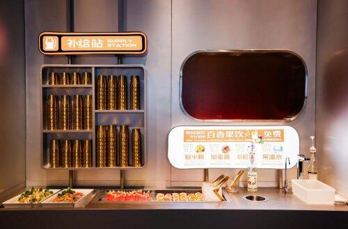 体验经济概念在这家探鱼LAB店最明显的反映就是增加了“自助区”。其实餐厅里设置自助区并不是什么新兴的概念,但从最近小红书、抖音等分享平台内容来看,这家探鱼LAB店让顾客“在自助区玩嗨了”。