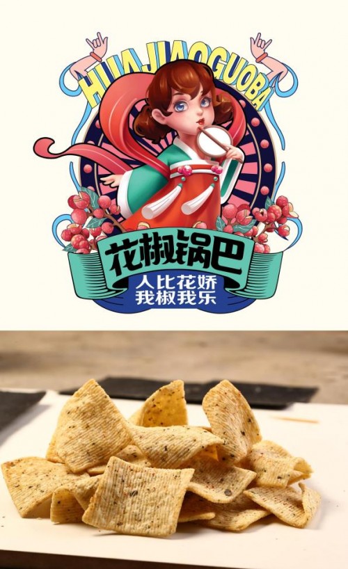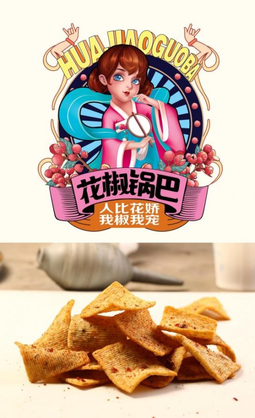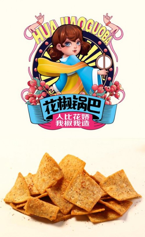 来到现代,傻二哥续写“花椒与美人”的故事,打破传统锅巴包装简朴的包装风格,用90后年轻一代的审美,以“更年轻·更国潮”的理念打造全新的产品视觉形象,身着精美汉服的二次元国潮美人翩跹起舞,配合rock摇滚手势,混搭风玩出新风尚。