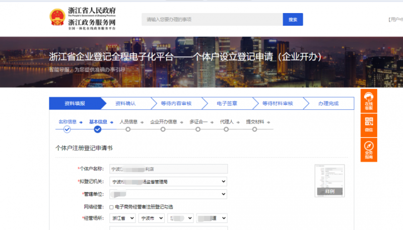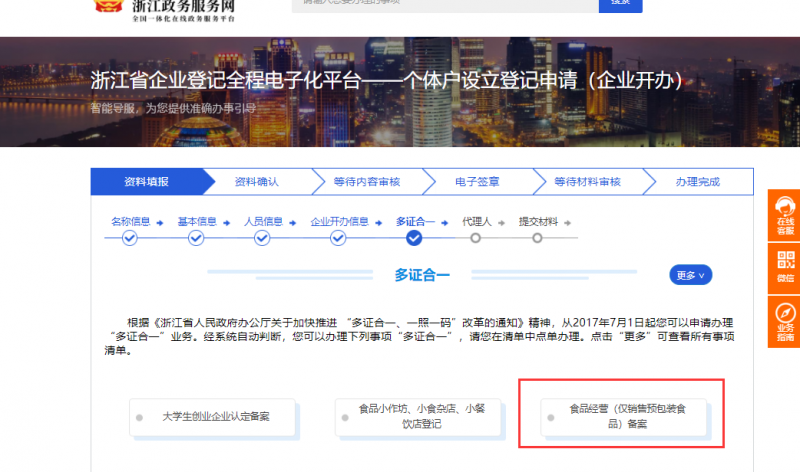仅销售预包装食品经营者可通过浙江省政务服务网“企业开办全程网办”专栏中的“我要开办企业”(全程电子化平台),进入设立登记流程,完成“多证合一”下的食品经营(仅销售预包装食品)备案申请;此外,在各地市场监管部门登记窗口也可线下指导办理。