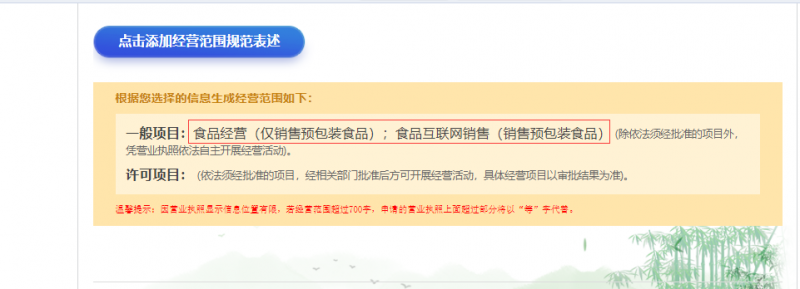 其中,基本信息中的经营范围实行规范化登记。经营者按照经营需要选择对应的“食品经营(仅销售预包装食品)”、线上的选择“食品互联网销售(销售预包装食品)”的规范化条目。如图所示: