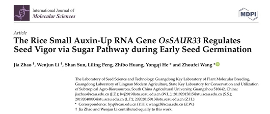 近日,华南农业大学农学院王州飞教授课题组在Int J Mol Sci(IF2020=5.923)和Front Plant Sci(IF2020=5.753)分别发表了题为“The rice Small Auxin-Up RNA Gene OsSAUR33 regulates seed vigor via sugar pathway during early seed germination”的研究论文和“Advances in the identification of quantitative trait loci and genes involved in seed vigor in rice”的综述论文。