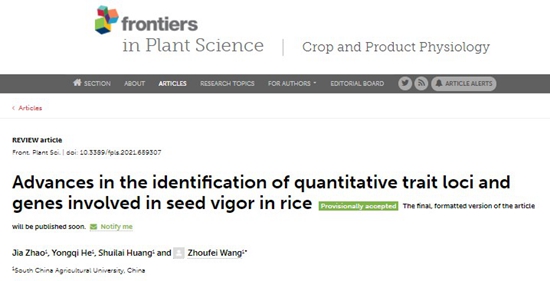 水稻种子活力是一个重要的农艺性状,包括种子的萌发、出苗和生长,以及种子的耐贮性和抗逆性等,对直播稻生产具有重要意义。在种子发育、贮藏和萌发过程中,种子活力受遗传和环境因素的影响。水稻种子活力与籽粒物质积累、种子脱水耐性、休眠、萌发、耐逆性,以及种子引发处理密切相关。该综述系统总结了在水稻种子发育、贮藏和萌发过程中,上述决定种子活力性状的数量性状位点(QTL)和基因挖掘方面的研究进展,并对今后研究内容进行了展望。该论文第一作者为在站博士后赵佳和何永奇副教授,通讯作者为王州飞教授(论文链接地址https://www.frontiersin.org/articles/10.3389/fpls.2021.659307/abstract)。