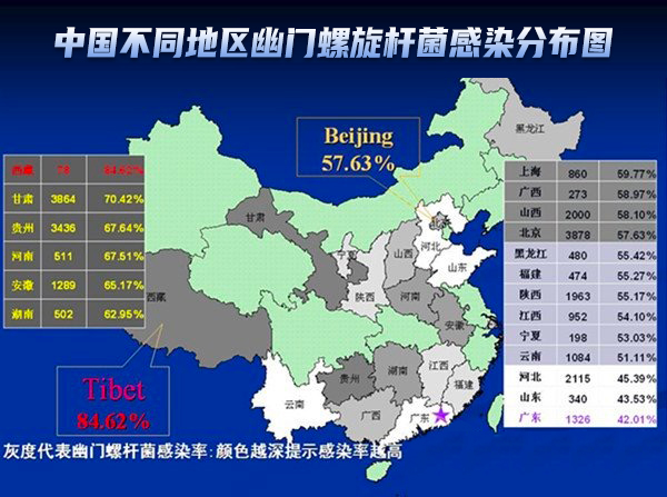 幽门螺杆菌作为目前所知能在人胃中生存的唯一微生物种类,它在全球自然人群的感染率超过50%,在我国各个地区感染幽门螺旋杆菌的概率有明显差异,平均感染率为59%,其中儿童的感染率平均为40%。