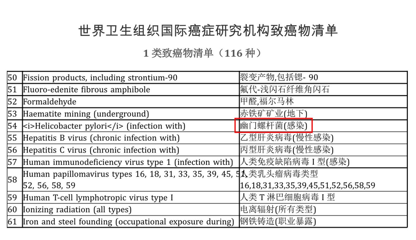 虽然并不是所有患幽门螺旋杆菌的患者都会得胃癌,但是由于反复得炎症刺激,特别是对于胃窦感染的患者,会增加胃癌的风险,所以也被世界卫生组织癌症研究机构列为一类致癌物。