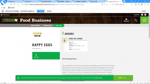 6月24日,世界农场动物福利协会(Compassion in World Farming International,简称CIWF)发布了2021年世界动物福利获奖名单,包括麦当劳(英国&爱尔兰)、玛莎百货、希尔顿海鲜酒店、达能酒店等在内的11家企业获奖。中国非笼养知名品牌鸡蛋——快乐的蛋荣膺CIWF2021金蛋奖,是11家获奖企业中唯一的中国企业,也是中国第一家获得这一殊荣的鸡蛋经销商,这标志着中国非笼养蛋鸡产业成功跻身于世界先进行列。