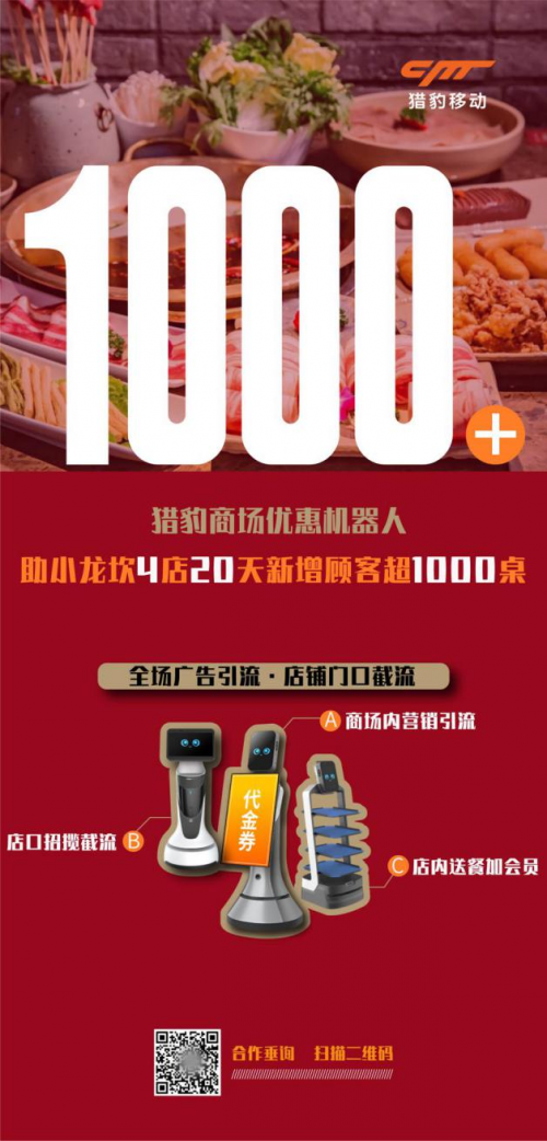 上线享库生活优惠券,为小龙坎引流只是一个缩影,通过覆盖41座城市、约1200家商场的12000多名猎豹商场优惠机器人,明星火锅店贤合庄单日新增近20桌顾客;秋二酸菜鱼开业一个月新增近千单;汉堡王30天多卖出10000份汉堡套餐;胖哥俩端午期间多卖300多份肉蟹煲……