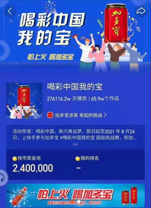 考虑到年轻消费者更倾向具有强烈互动感、社交感的内容营销,加多宝还同步举行了#喝彩中国 我的宝#快手超级挑战赛活动,以“举罐喝彩”的形式与受众互动,品牌内容在年轻群体中得以释放,和年轻人建立起更深的沟通交流。