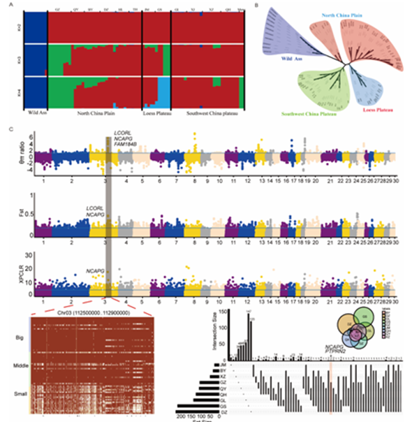 (A)家驴群体结构;(B)家驴NJ树;(C)家驴选择信号与基因型分析