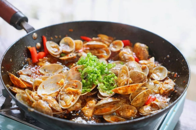陈梦是山东青岛人,“吃蛤蜊,喝啤酒”是岛城习俗,“辣炒蛤蜊”也是每个青岛人的拿手好菜。将皮薄肉鲜的花皮蛤放在清水里静置两小时沥净水分备用。锅中放入山茶油,待油温升高后加入花椒、蒜末、葱花、红辣椒段和姜丝,小火煸炒出香味倒入花蛤,大火翻炒至花甲开大口,调入适量的调味料即可出锅开吃了。