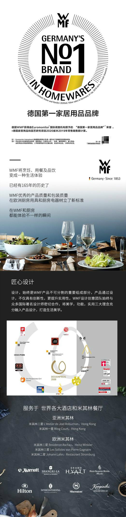 凭借着与生俱来的德式严谨,以及百年如一日的品质追求,WMF已然成为了世界顶级的厨具品牌之一,并长期在德国厨具市场稳占第一地位,被Euromonitor国际调查机构授予“德国第一家居用品品牌”的荣誉。同时,WMF在百余年间也斩获了包括“设计界奥斯卡”红点设计奖、“国际工业设计金像奖”IF设计奖、“德国设计行业最高奖项”德国国家设计奖等200多项行业大奖。