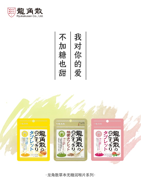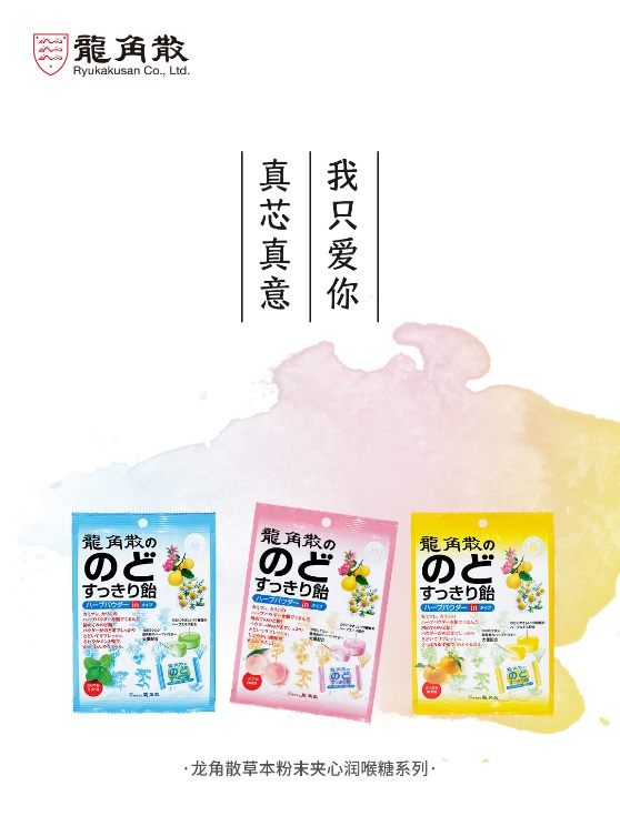 龙角散草本粉末夹心润喉糖为龙角散独创,将具有护嗓功效的龙角散草本粉末内置于富含多种草本萃取物的糖心之中。一次含服,双重口感,独特夹心糖结构让护嗓草本成分均匀地滋润整个咽喉部位。该系列产品有三种口味——薄荷味、白桃味和柚子味,可以满足消费者不同的口味偏好。