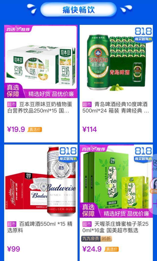 忙完工作回家后,打开电视,窝进沙发,拿起手机……等等!好像还差了点意思。炎炎夏日,没有快乐水,何以解忧!来几瓶冰镇啤酒小酌一番,这才是夏季夜晚正确的打开方式!冰凉的黄色液体缓缓入喉,一天的自然温度在此时慢慢降下,心情也渐复平静,可以彻底享受酷热后的清凉瞬间。而“真快乐”APP打造的清爽消暑季,青岛啤酒、百威啤酒皆是精选原料,并且都是真低价,趁着活动大家快点囤起来。除了成年人的快乐水,“真快乐”APP上的豆本豆原味豆奶、天喔茶庄蜂蜜柚子茶、可口可乐汽水、盼盼冰红茶等消暑饮料应有尽有,让你轻松畅快痛饮。