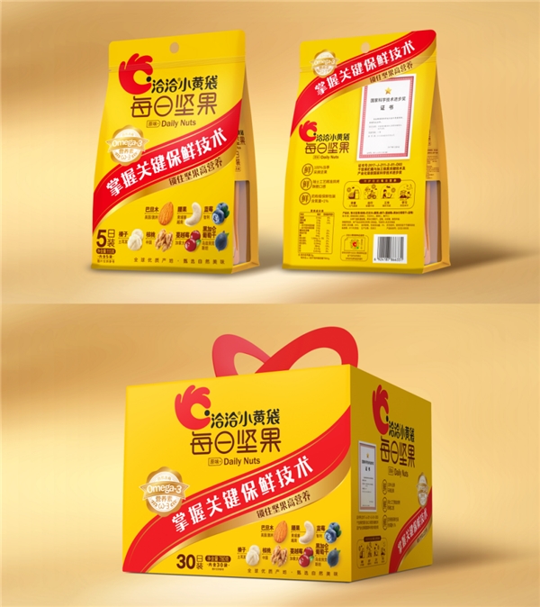 洽洽小黄袋产品定位从“掌握关键保鲜技术”升级为“掌握关键保鲜技术 锁住高营养”,全新包装升级在强调锁住坚果“高营养”价值的同时,重点标注坚果中自然含有Omega-3(又写作ω-3,中文音译“欧米伽-3”)的营养成分,突出产品营养属性。洽洽小蓝袋包装和配方也全新升级,以零添加蔗糖、特别添加40亿(每100克)活性益生菌为特点,打造营养加倍更美味的差异化特色。