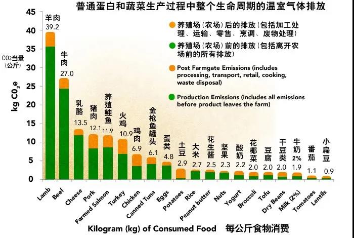 要知道,肉类从农场(池塘)到餐桌需要经历诸多环节,中间产生碳排放的过程包括:饲料种植所使用的农药和化肥、动物养殖、加工、运输、烹调、废物处理及浪费等。下图中是20种常见食物的碳排放量,可以看到羊肉、牛肉和乳酪的碳排放位列前三名,而鱼类、禽类的碳排放相对较低,排放量不及牛羊肉的一半。由此可以推测,未来随着碳中和相关政策的推行,牛、羊等畜肉的养殖成本将不断提高。