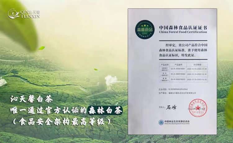 以坚持打造“有机、生态、健康”的白茶产品为经营理念的福建沁天馨生态农业开发有限公司,其生产的白茶产品经国家林促会从土壤到茶叶的检测和实地考察,目前已全部通过森林食品的认证,并颁发了证书。森林食品是有机食品的上限,是国家对食品安全等级的最高级认证。